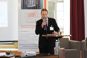 Anschließend zog Projektleiter Tim Tjettmers eine kurze Bilanz aus den vergangenen drei Jahren intensiver und spannender Projektarbeit. Es wurde deutlich, wie differenziert das Feld der Gefängnisalphabetisierung betrachtet werden muss: Während man mit den Grundbildungsangeboten im Jugendstrafvollzug im Bundesdurchschnitt eher zufrieden sein kann, lässt sich in der Angebotsstruktur des Erwachsenenvollzugs deutlich Verbesserungspotential erkennen. Zugleich nutzte er die Gelegenheit, "all jenen meinen Dank auszusprechen, die uns als Modellstandort, im Projektbeirat oder auf ministerialer Ebene aktiv bei der Umsetzung des Projekts unterstützt haben.“ [...zum Vortrag im Wortlaut]