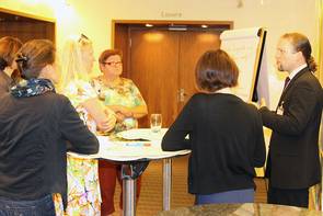 Anschließend bot das World-Café den Teilnehmenden bei Kaffee und Kuchen die Möglichkeit zum lockeren Austausch gerahmt von drei für die Grundbildungsarbeit im Gefängnis relevanten Fragestellungen: